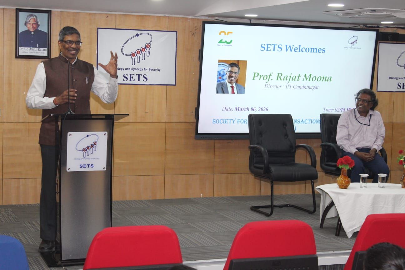 Prof. Rajat Moona, Director, Indian Institute of Technology Gandhinagar visited Society for Electronic Transactions and Security (SETS), Chennai (Under the Office of the Principal Scientific Adviser to the Government of India) on 06 March 2026. He interacted with scientists and project teams engaged in research and development and appreciated the R&D activities and specifically the SETS VPN solution that is deployed for key agencies. In his address he brought out the strengths of R&D organisations like SETS, C-DAC, DRDO, C-DOT and others and emphasised the importance of developing indigenous technology and wide scale deployment and usage towards Viksit Bharat.