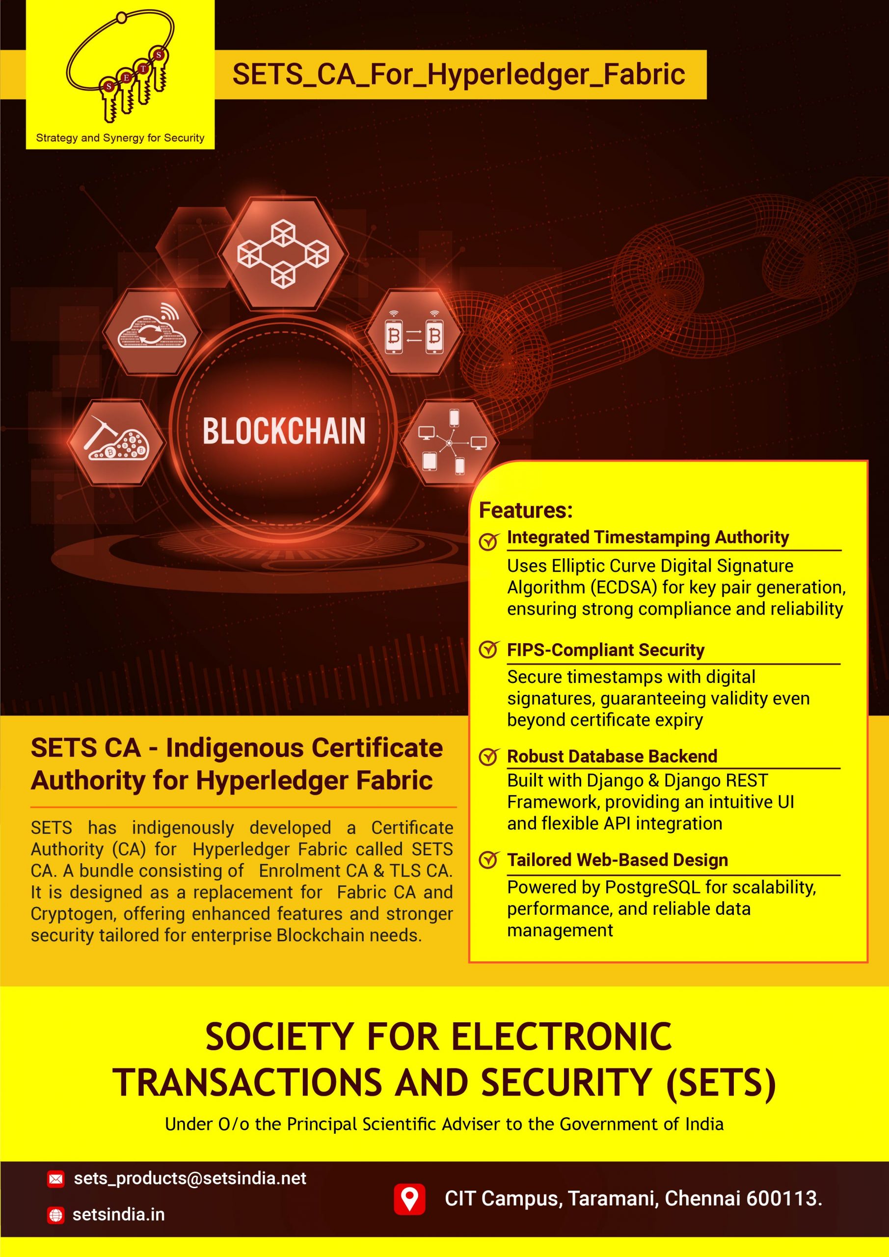 SETS CA for Hyperledger Fabric is a trusted, security-hardened CA for Hyperledger Fabric, providing robust identity and trust management for permissioned blockchain networks. It supports concrete identity lifecycle management, secure user and node credential issuance, validation, and revocation, along with signature generation and verification. SETS CA features a flexible, plug-and-play cryptographic framework with algorithms tested for FIPS 140-2 compliance, ensuring high assurance and vulnerability-resilient operations.