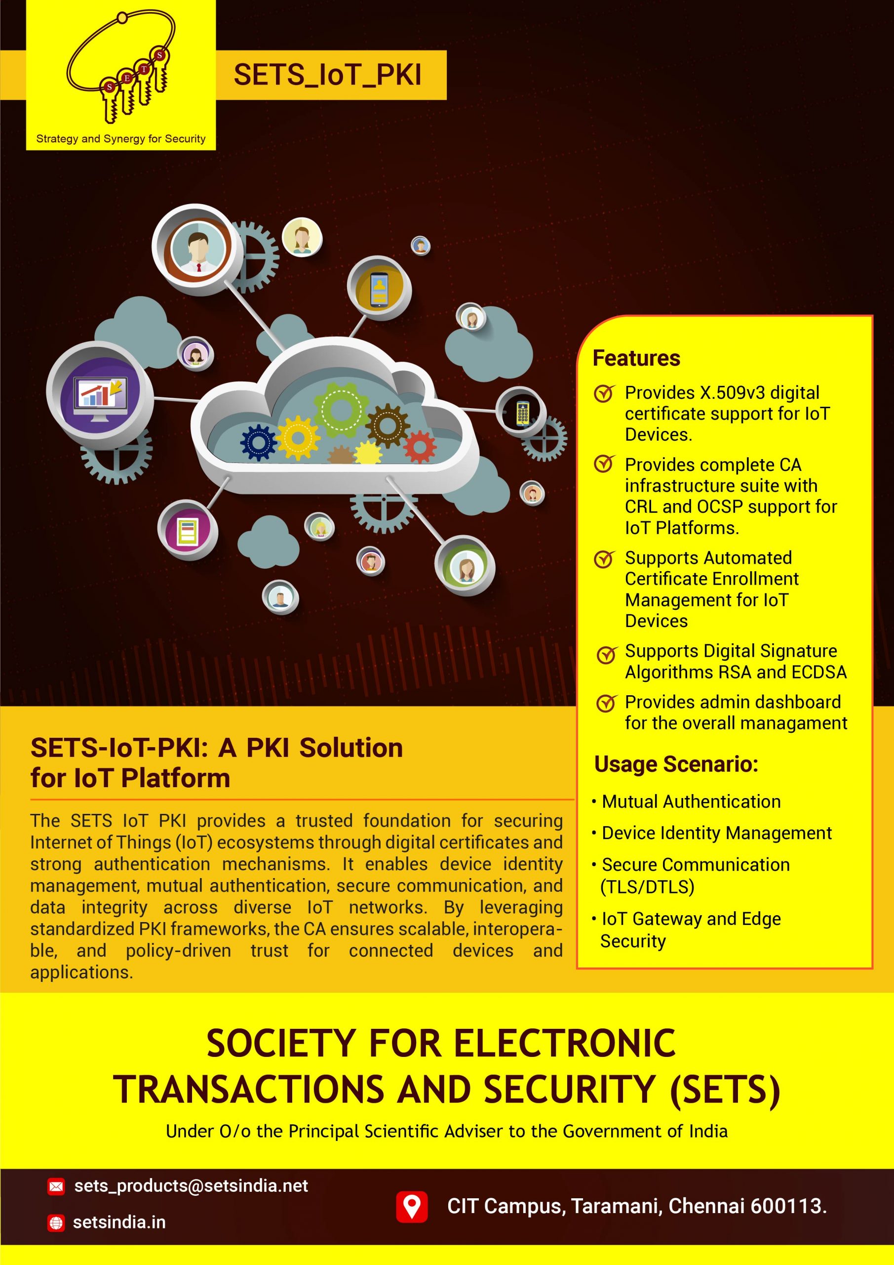The SETS IoT PKI provides a trusted foundation for securing Internet Of Things (IoT) ecosystems through digital certificates and strong authentication mechanisms. It enables device identity management, mutual authentication, secure communication, and data integrity across diverse IoT networks, By leveraging standardized PKI frameworks, the CA ensures scalable, interoperable, and policy-driven trust for connected devices and applications.