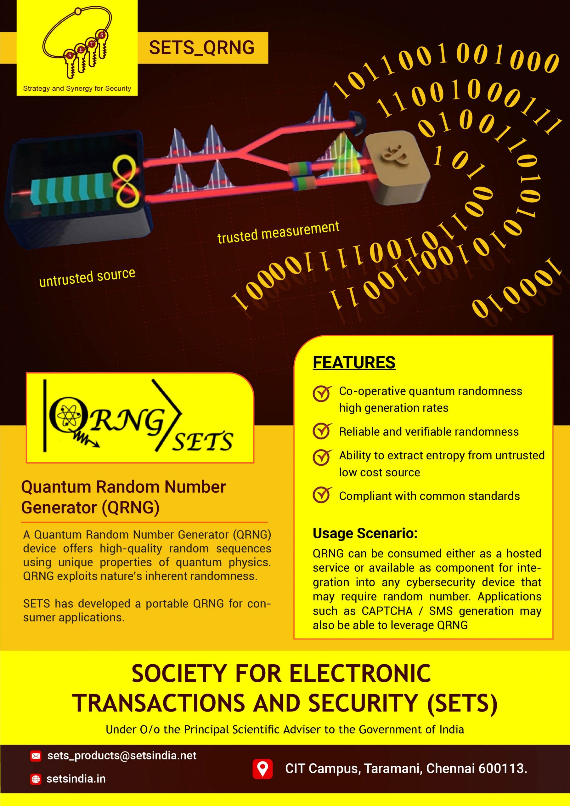 A Quantum Random Number Generator (QRNG) device offers high-quality random sequences using unique properties of quantum physics. QRNG exploits nature’s inherent randomness. SETS developed a portable QRNG for consumer applications.